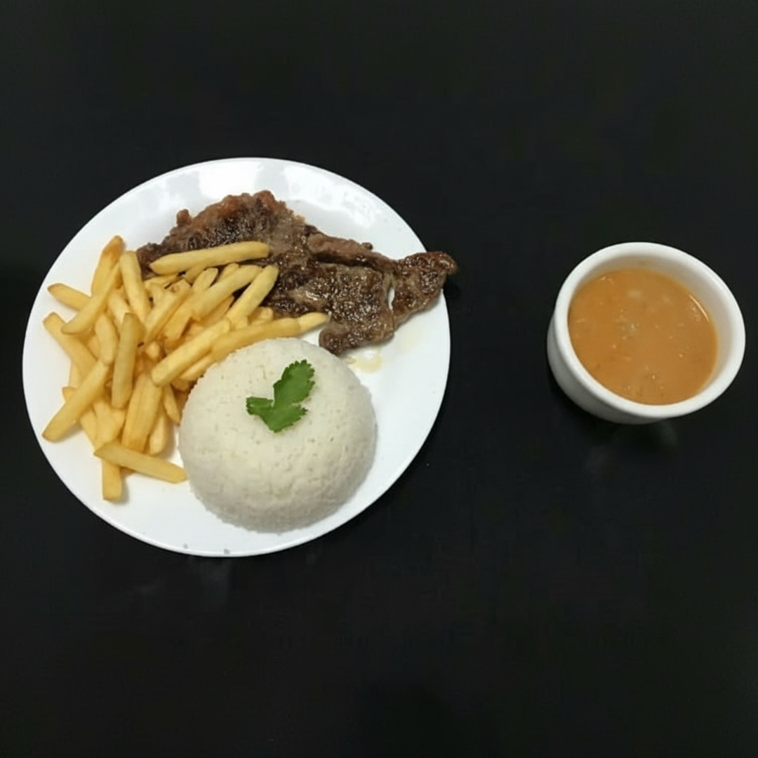 Delicie-se com nosso Contra-Filé Acebolado. Um prato exuberante da categoria 'Pratos Executivos', primorosamente preparado para satisfazer o seu paladar. A suculência do contra-filé é perfeitamente equilibrada com a leveza da cebola, acompanhado de arroz branco soltinho e um feijão encorpado e saboroso. Opte por complementar essa experiência gastronômica com batatas fritas crocantes ou uma refresc