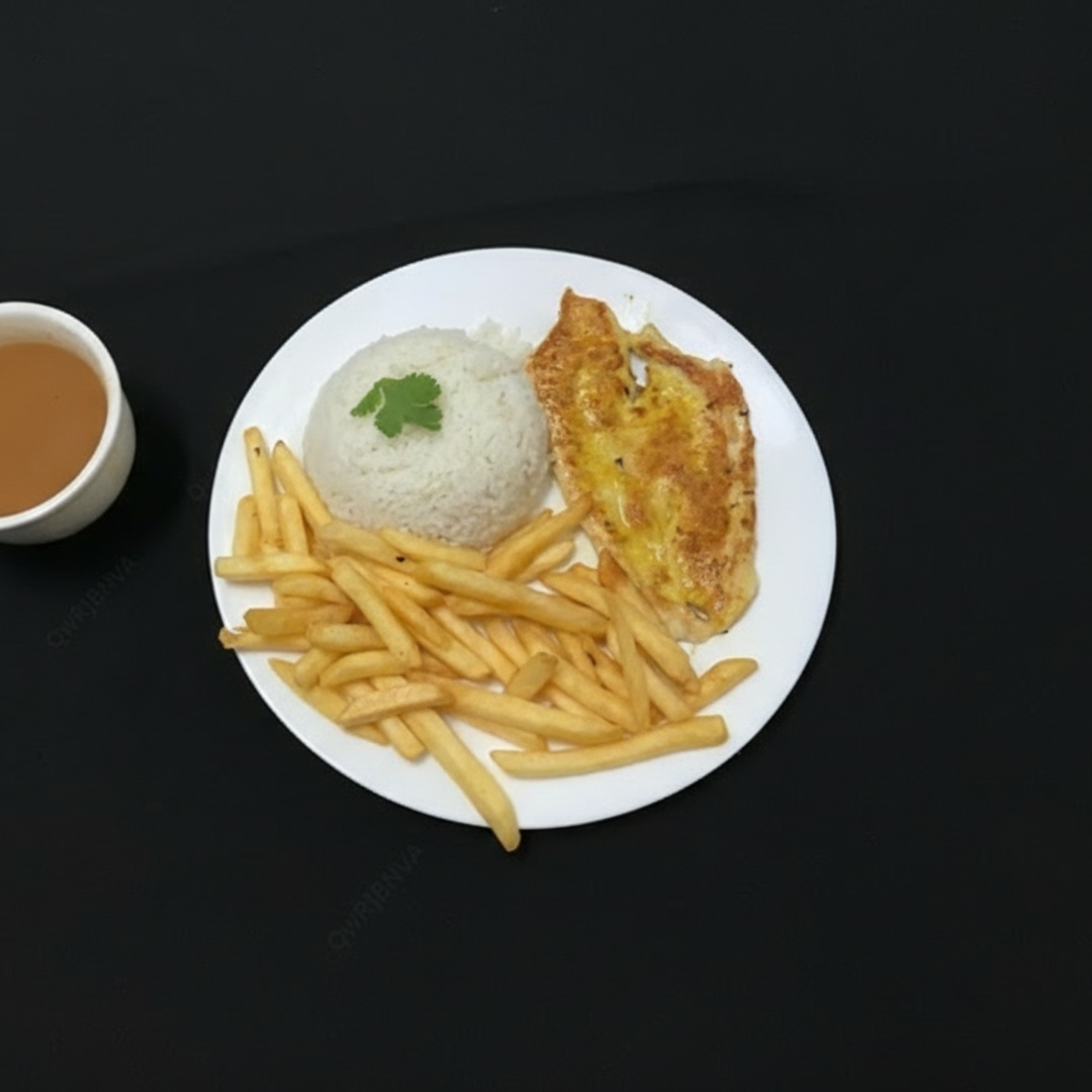 Omelete, arroz, feijão, fritas ou salada.