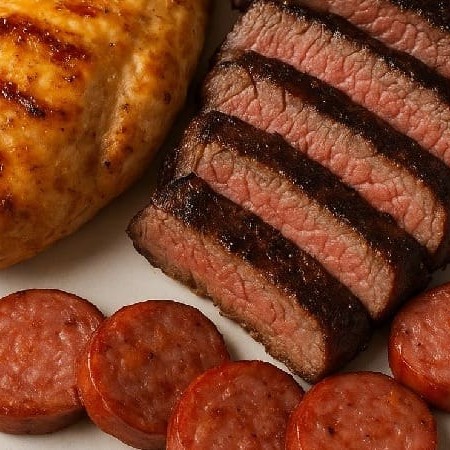 Uma porção composta por: contra filé grelhado, calabresa defumada cortada em fatias e filé de frango temperado.