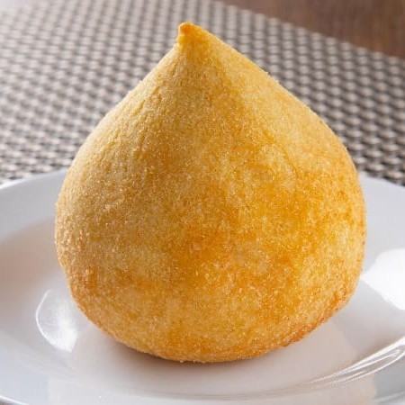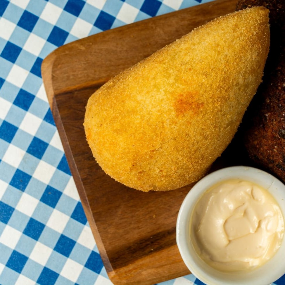 Preparado com a mesma massa macia e dourada da coxinha, moldado em formato de risole e recheado de maneira simples e saborosa. Uma variação que combina textura leve com um recheio bem temperado.