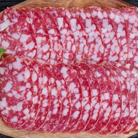Fatias finas e sabor intenso! Nosso salame é curado tradicionalmente, com um equilíbrio perfeito de temperos e um toque levemente defumado.