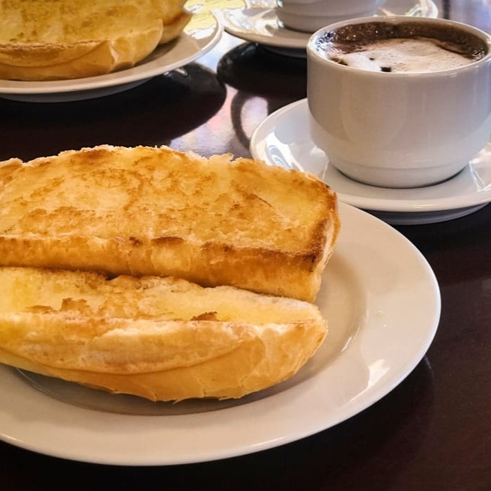 Clássico pão francês quentinho com manteiga na chapa, tornando um sabor crocante e dourado + café expresso grande, forte e encorpado!