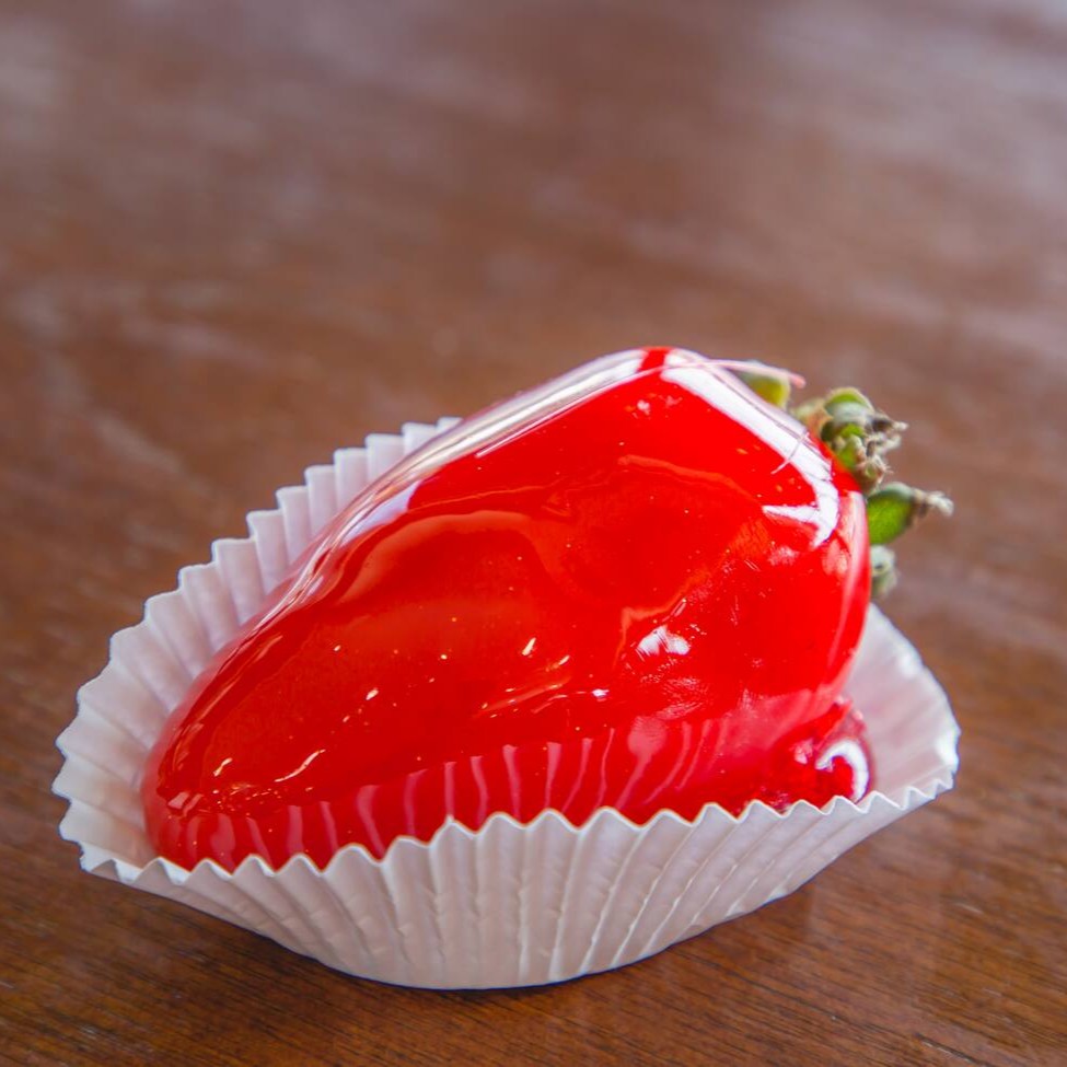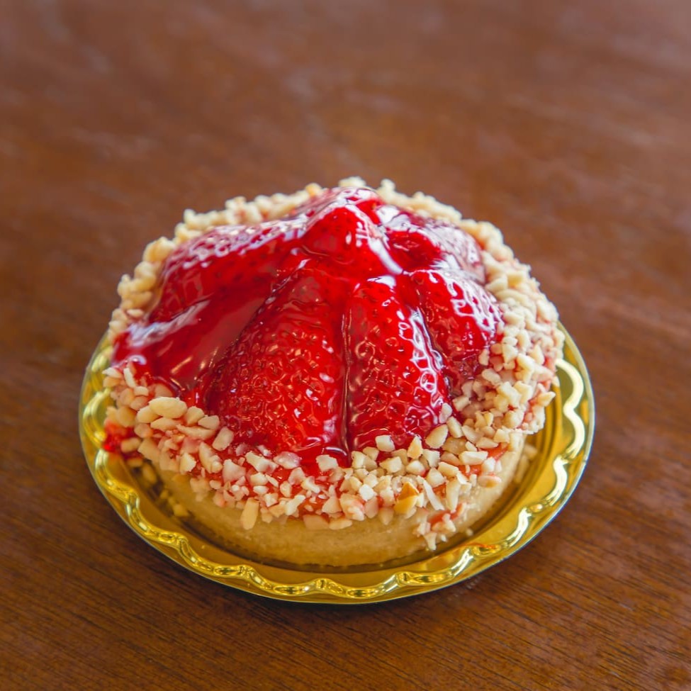 Combina uma base crocante de biscoito amanteigado, um creme de baunilha suave e levemente doce, e morangos frescos e vermelhos, finalizados com uma leve camada de geléia brilhante.