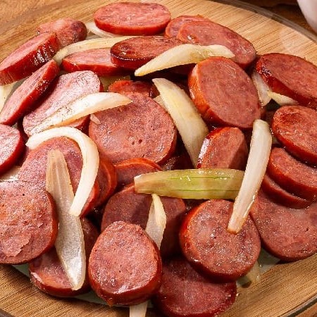 Fatias de calabresa suculentas, refogadas com cebolas douradas, temperadas na medida certa.