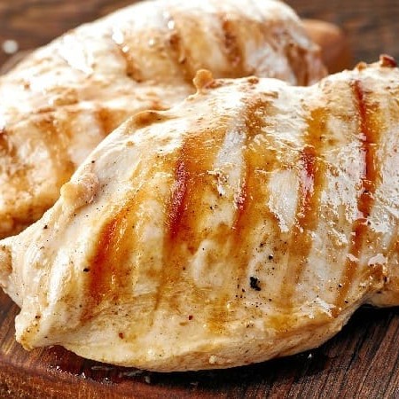 Cubos de peito de frango grelhados, servidos com cebolas em rodelas, temperados de forma simples.