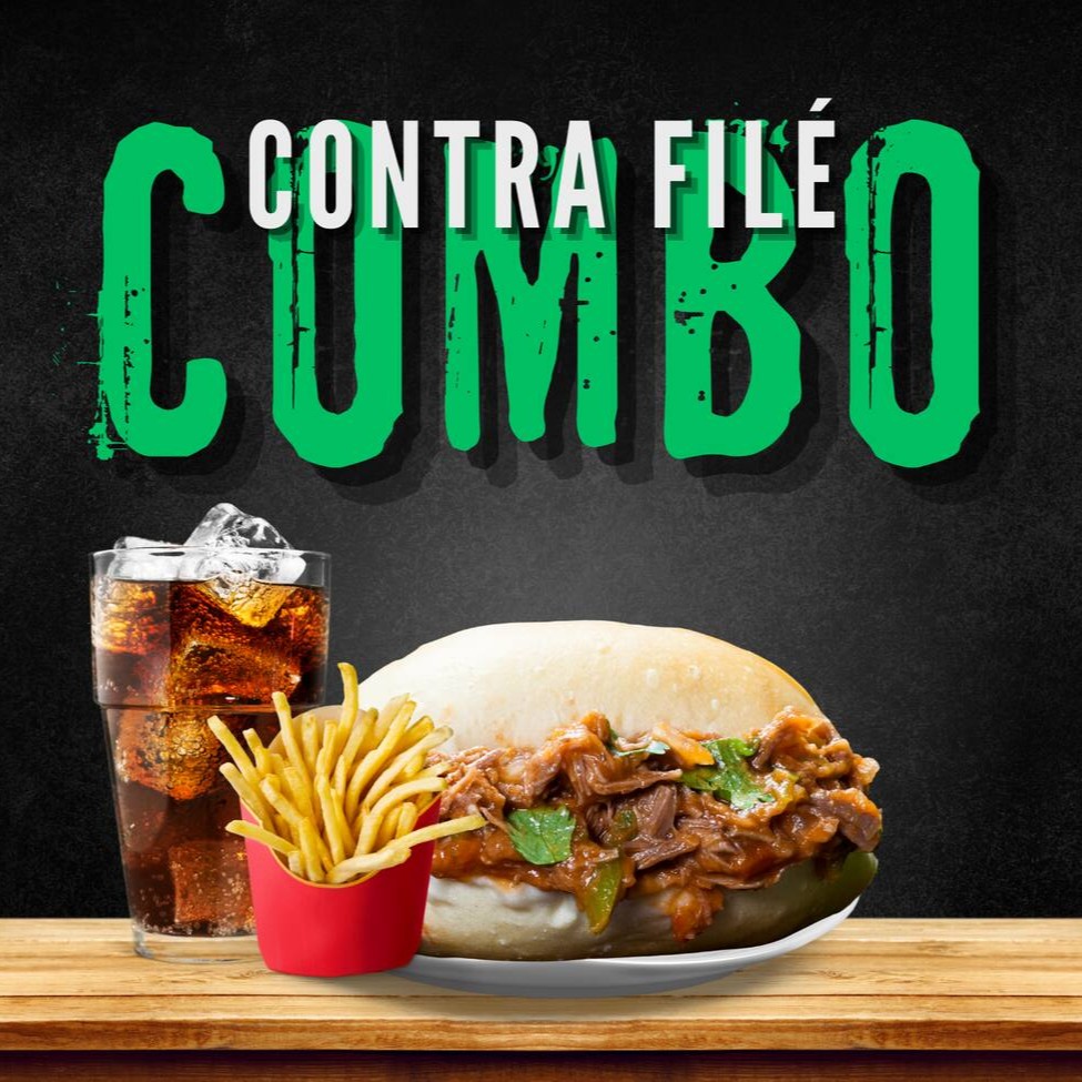 Sanduíche de pão macio (pão francês ou baguete) com contra filé grelhado, queijo derretido e vinagrete saboroso. Acompanha batatas fritas crocantes e uma Coca-Cola gelada (350ml).