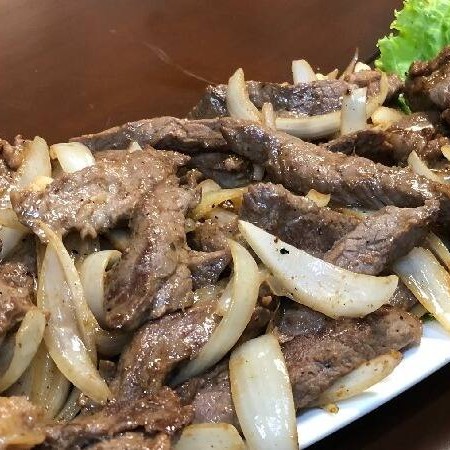 Bifes de contra filé grelhados e servidos com cebolas refogadas, temperados de forma simples e equilibrada.