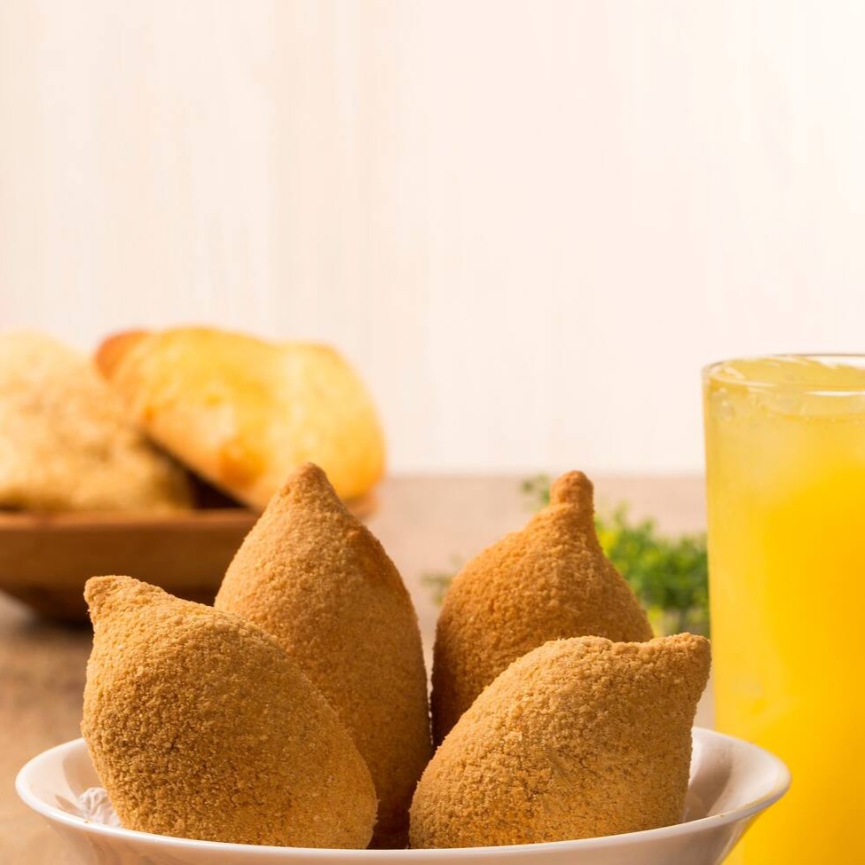 Uma coxinha suculenta recheada com frango desfiado e bem temperado. Além disso, você pode turbinar sua coxinha com Catupiry + suco natural de laranja 500ml docinho e feito na hora.