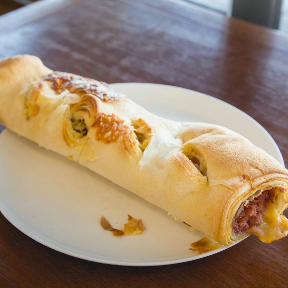 Pão de massa leve em formato alongado, assado até ficar dourado, recheado com queijo que derrete e se integra à maciez do miolo e à casquinha fina e crocante.