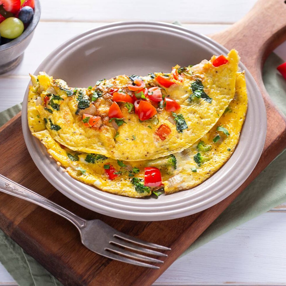 Nosso omelete é feito na hora com ovos frescos, fatias de presunto selecionado e queijo derretido — tudo temperado com temperos selecionados.