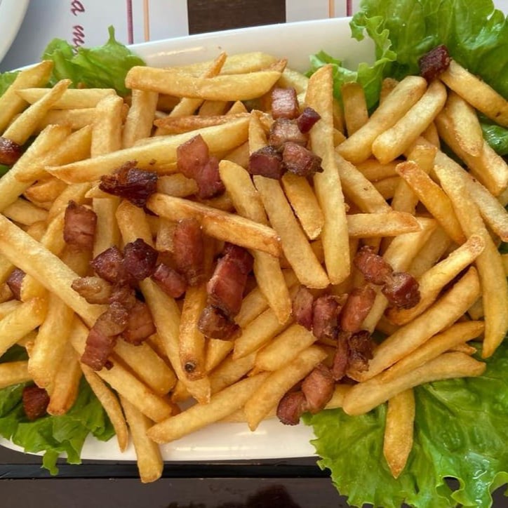 Batatas fritas com bacon ou cheddar. Aproximadamente 600g.