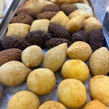 Salgadinhos fritos na hora. Escolha os seus preferidos.