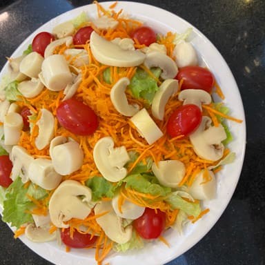 Alface americana, palmito, cenoura ralada, tomate cereja, champignon e azeitonas