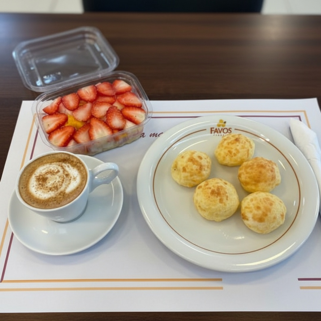 O Combo 4 é uma opção irresistível para um café da manhã ou tarde delicioso e nutritivo. Composto por seis mini pães de queijo, crocantes por fora e macios por dentro, acompanhados de uma bebida quente à sua escolha, para aquecer o paladar e o coração. Para completar, uma refrescante salada de frutas pequena, oferecendo uma variedade de sabores naturais e ricos em vitaminas. Uma combinação perfeita para começar ou continuar bem o Dia.