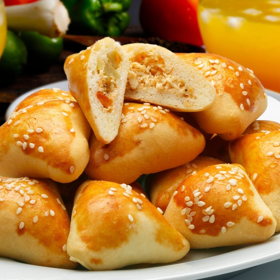 Massa macia e levemente dourada, preparada com farinha de trigo, fermento natural e um toque de azeite. Recheios generosos e bem temperados: carne, ricota, frango ou queijo. ️