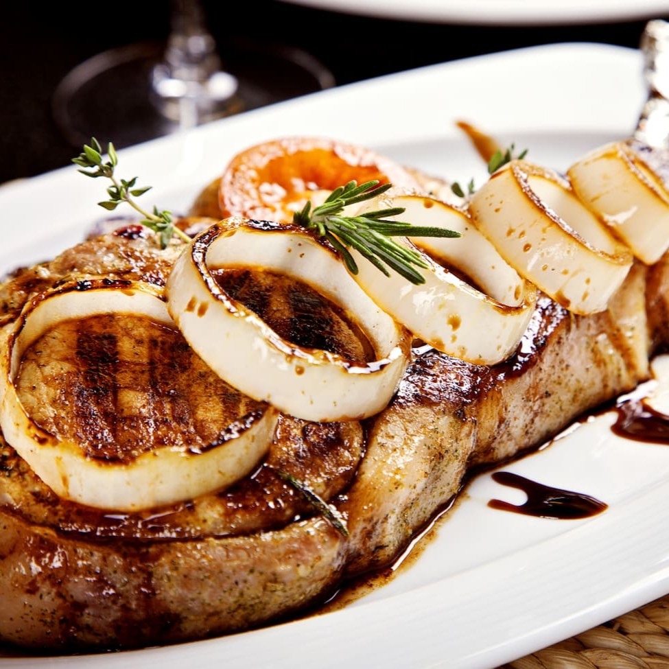 Corte de bife bovino grelhado, coberto com cebolas caramelizadas. Porção com aproximadamente 400g.