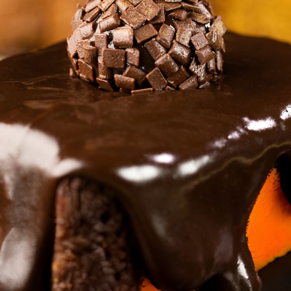 Deliciosa fatia de bolo de cenoura coberto com chocolate e um toque especial de um brigadeiro para finalizar. Aproximadamente 260g.