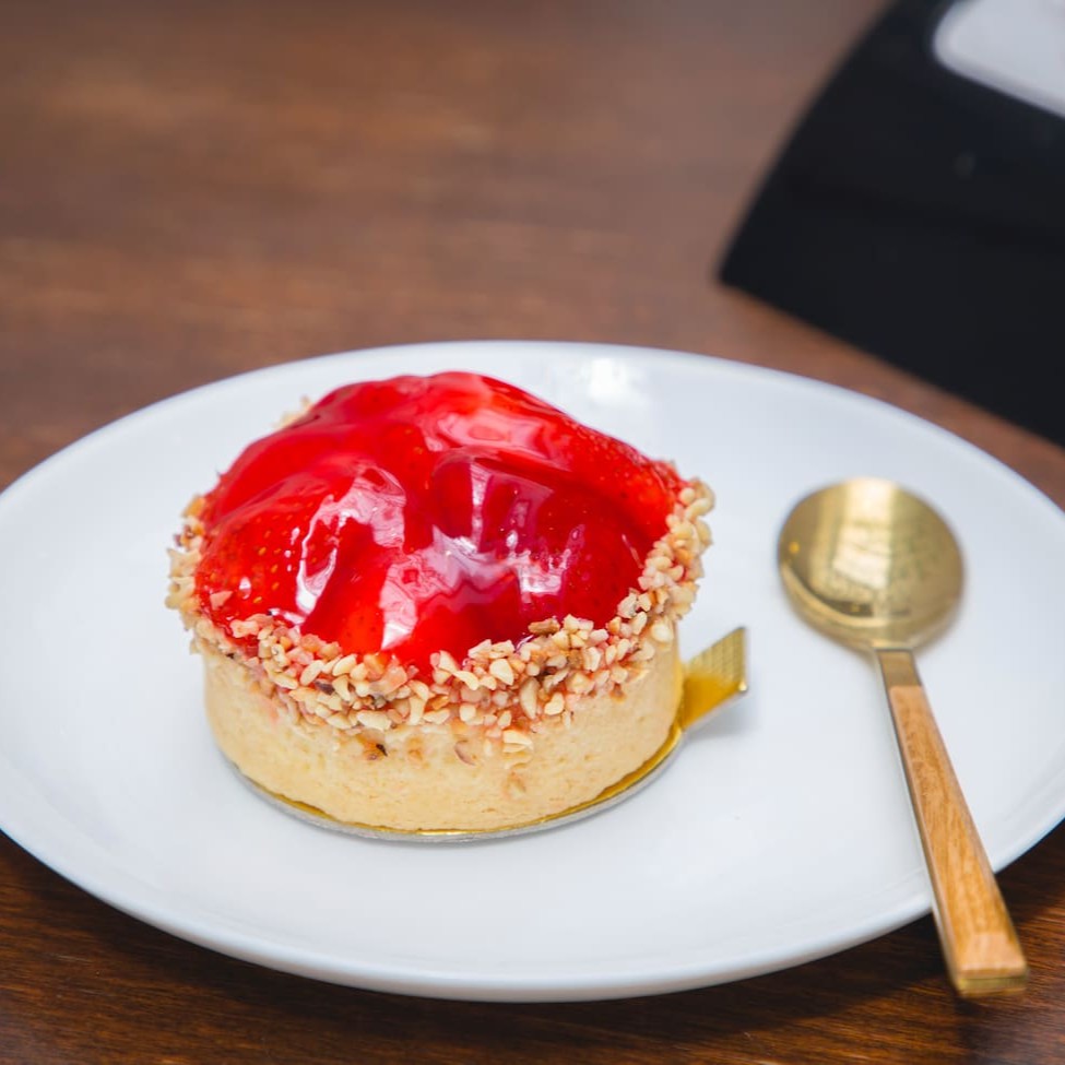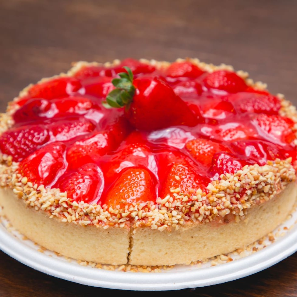 Massa amanteigada crocante recheada com creme de baunilha caseiro e morangos frescos, finalizada com gelatina brilhante.
