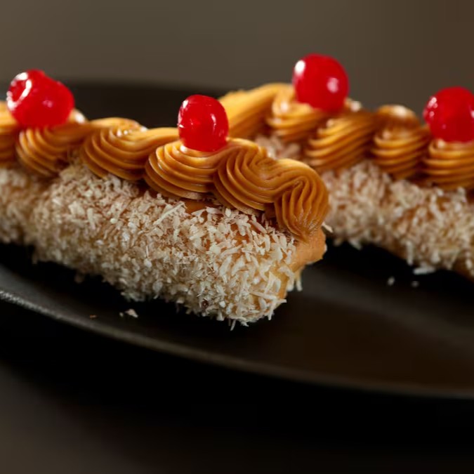 Bolo enroladinho com recheio de doce de leite e coberturas diversas.