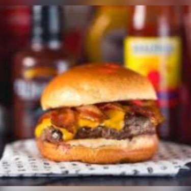 Pão de hambúrguer, hambúrguer de carne, queijo prato e bacon.