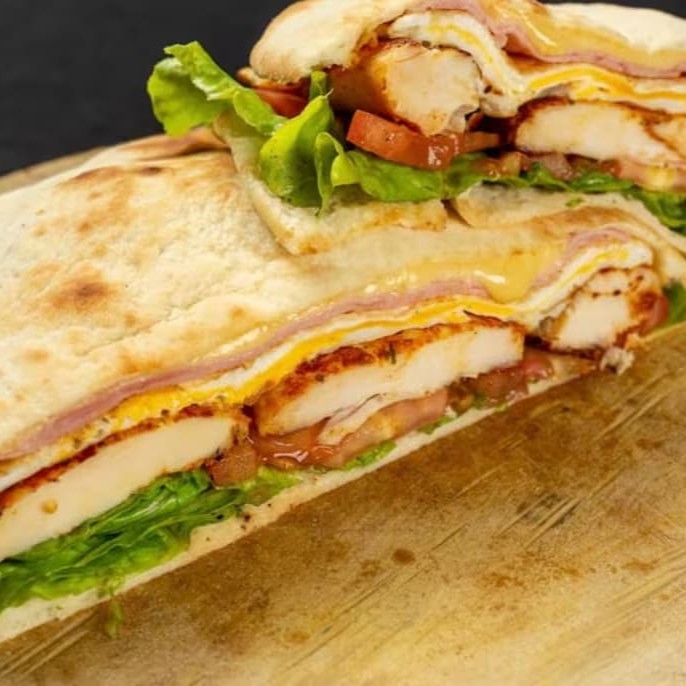 Pão Sírio, Filé de Frango, Ovo, Maionese, Queijo, Alface e Tomate. Não acompanha Batata!