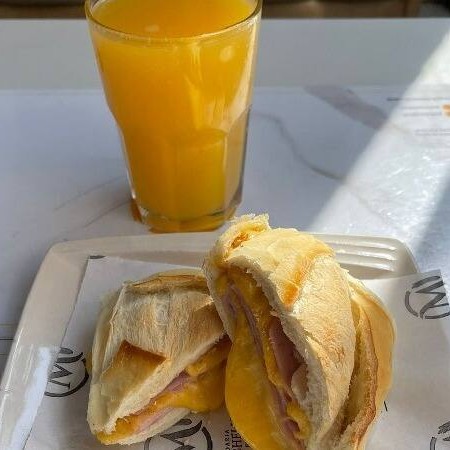 Um Delicioso Misto Quente no Capricho, Acompanhado de um Refrescante Suco de Laranja!