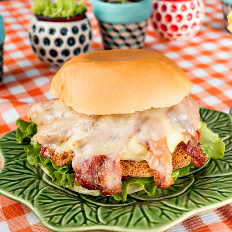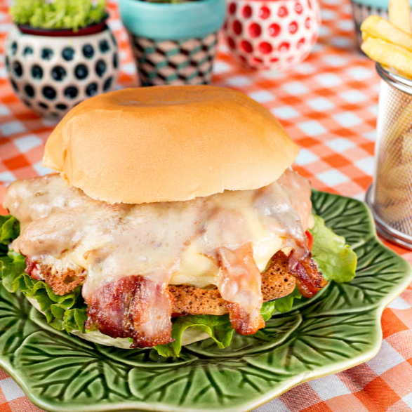 X-Salada Bacon, com hambúrguer de 100g, bacon crocante, alface, tomate e maionese. Obs: Este prato é servido sem batatas fritas.