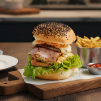 2 Hambúrgueres, Presunto, Queijo Prato, Ovo, Alface, Tomate, Bacon, Batata Palha, Calabresa e Catupiry.
