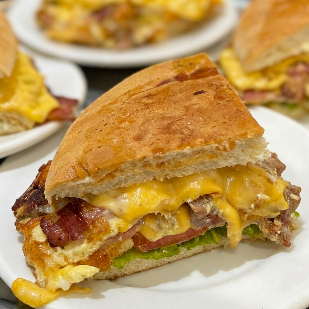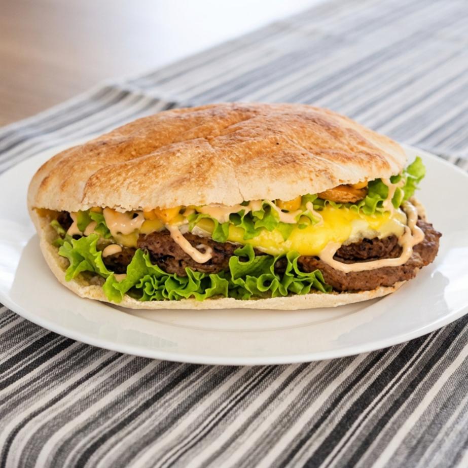 Pão de beirute, contra filet, presunto, queijo, bacon, ovo, alface e tomate. (não serão substituídos ou acrescentados itens)