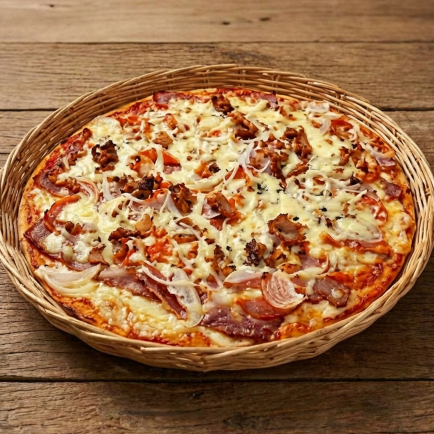 Massa crocante calabresa, presunto, atum, ervilhas, tomate e mussarela. (não serão substituídos itens)