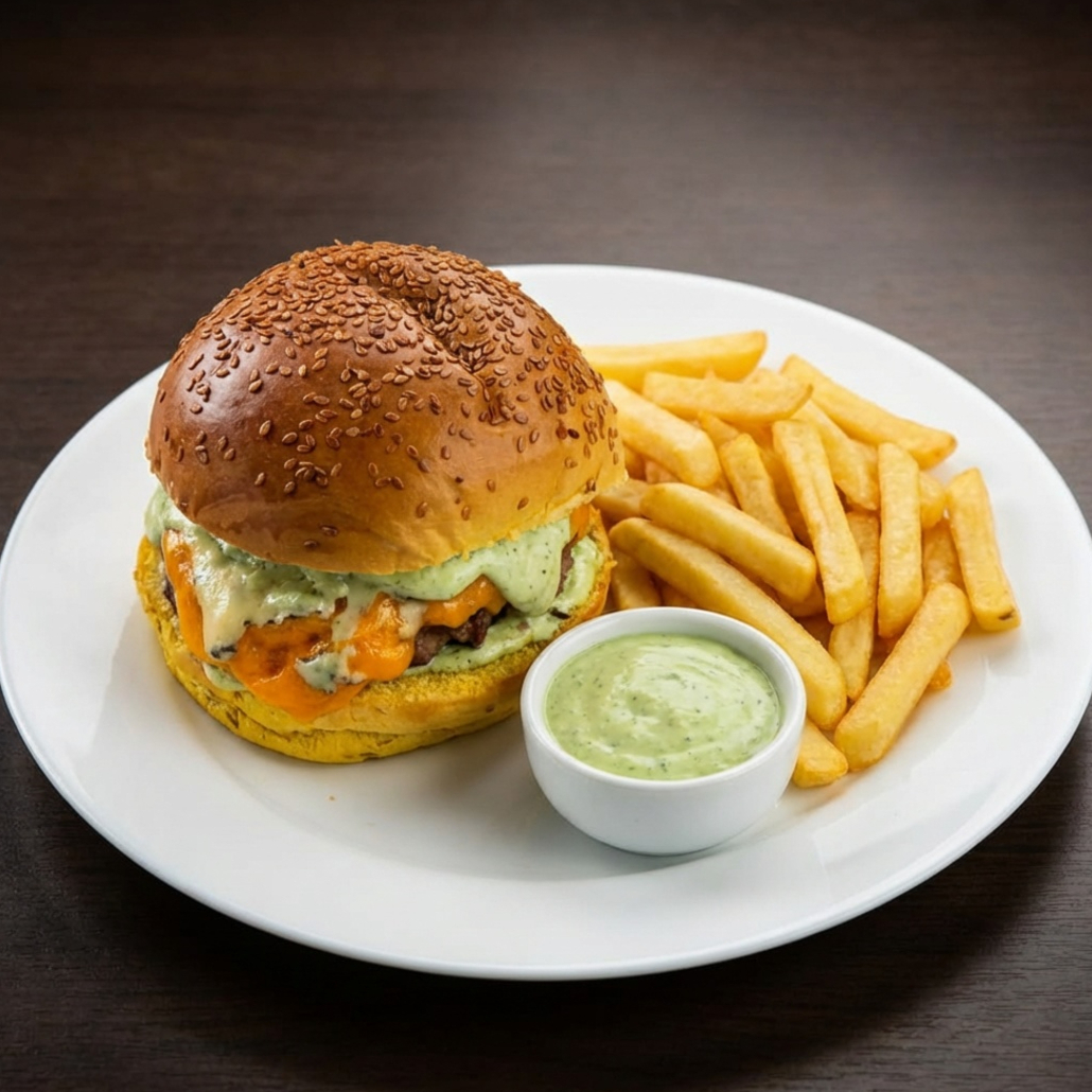Hamburguer 150 gramas (blend de carnes nobres), mussarela, Catupiry, fatias de bacon crocantes, alface e tomate, maionese verde no pão de hamburguer e fritas. (não serão substituídos ou acrescentados itens)