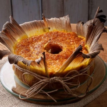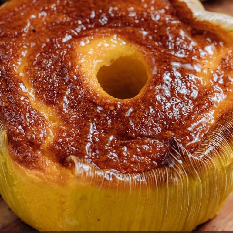 Delicioso bolo caseiro feito com milho fresco ralado, leite de coco e açúcar, assado na palha de milho para aroma especial e tradicional. Aproximadamente 300g.
