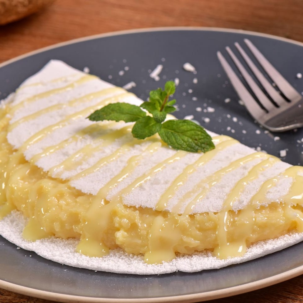 Deliciosas tapiocas recheadas com Banana, Coco, Morango e Leite Condensado.