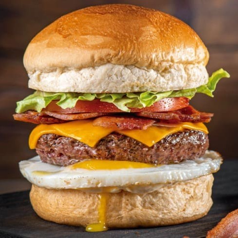 Hambúrguer, alface, tomate, bacon, ovo, queijo prato, catupiry e maionese
