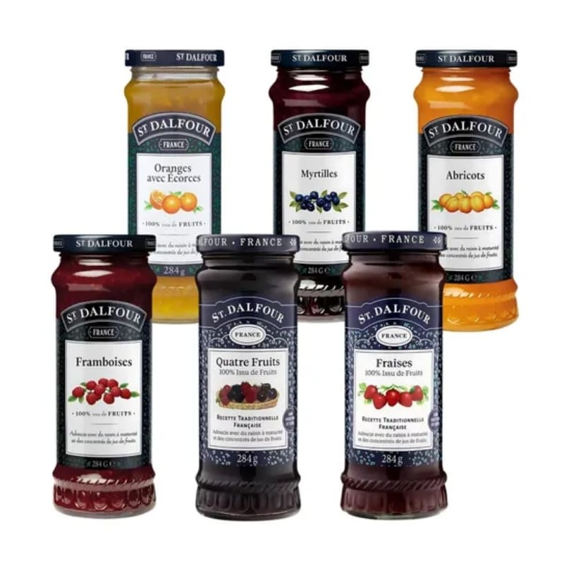 A linha de Geleias St. Dalfour 284g é conhecida por ser 100% natural, sem adição de açúcar refinado, adoçada apenas com sucos concentrados de frutas (geralmente uva e tâmara). É fabricada na França e muito apreciada por quem busca produtos mais saudáveis e saborosos.