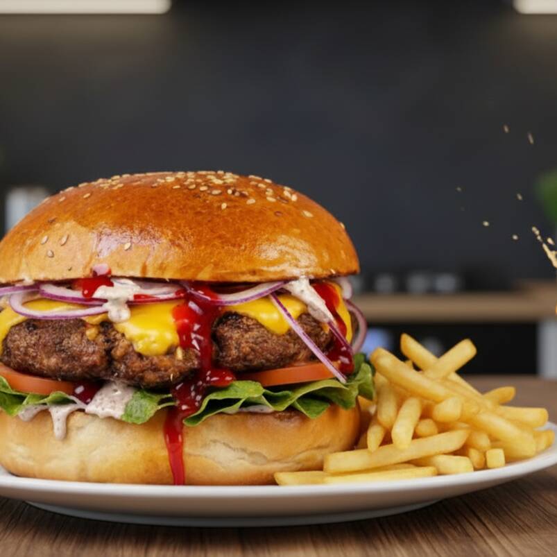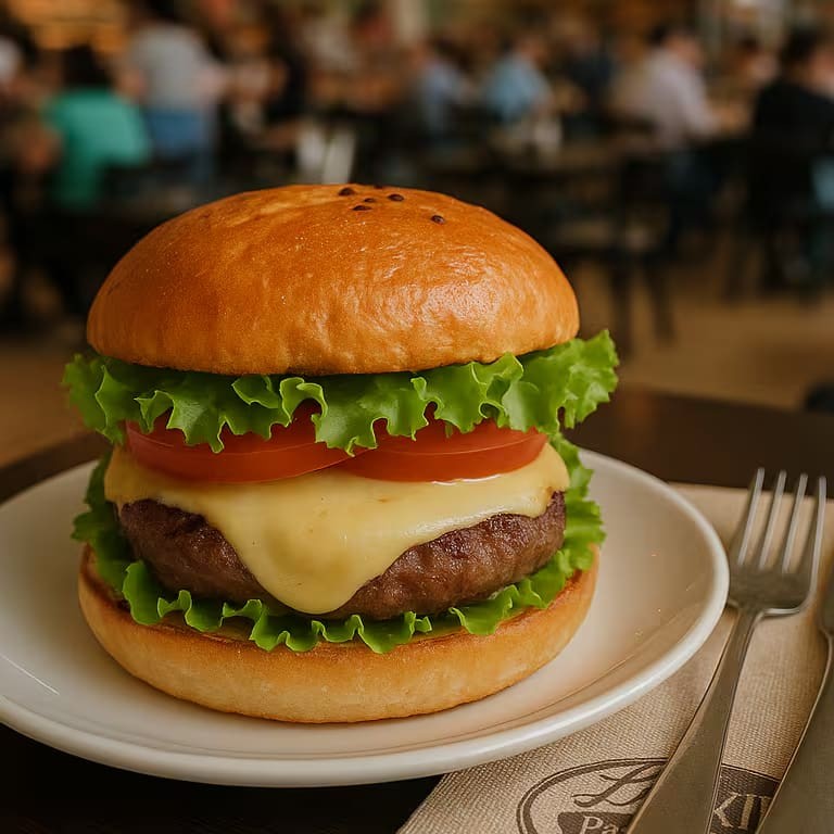 Um pão de hambúrguer artesanal, com aquele toque especial na massa, e um hambúrguer Angus de 120g, suculento e cheio de sabor. Essa combinação proporciona uma experiência deliciosa, perfeita para quem aprecia um bom hambúrguer com qualidade e sabor marcante. Foto ilustrativa por Ia.