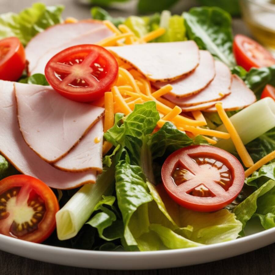 Essa combinação de ingredientes torna a salada não só deliciosa, mas também bastante nutritiva e equilibrada. O palmito, a alface, o tomate, o presunto, o queijo, o peito de peru e o vinagrete juntos criam uma mistura de sabores e texturas que agradam a muitos paladares. É uma opção perfeita para uma refeição leve, refrescante e cheia de sabor. Foto ilustrativa por Ia.
