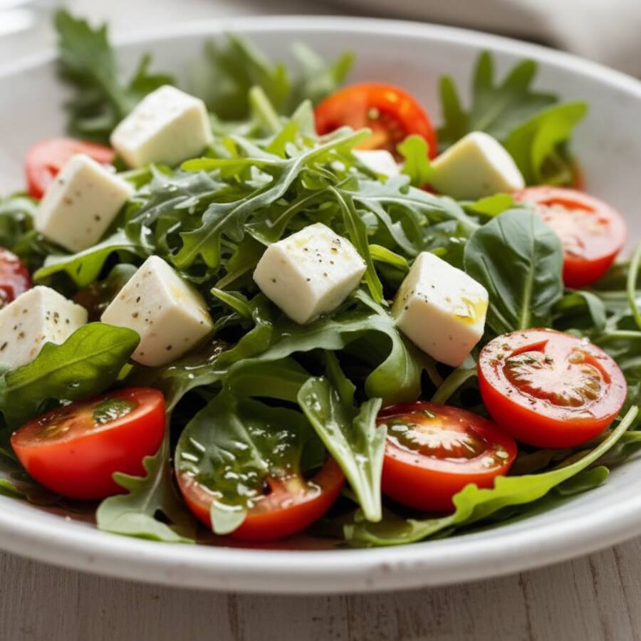 Uma salada caprese com rúcula, tomate, manjericão e muçarela de búfala em cubos é realmente deliciosa e cheia de frescor. Regue generosamente com azeite de oliva extra virgem. Se desejar, adicione um pouco de vinagre balsâmico ou uma redução de balsâmico para um toque adocicado e sofisticado.- Tempere com sal e pimenta-do-reino a gosto. Foto ilustrativa por Ia.