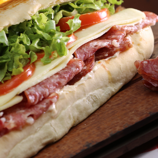 Pão Sírio, Queijo Prato, Presunto, Maionese Verde, Alface, Tomate e Fritas.