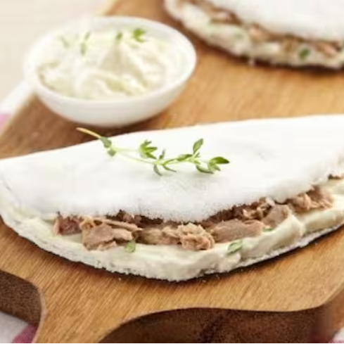 Baguete de queijo com manteiga na chapa, passando requeijão frio para finalizar
