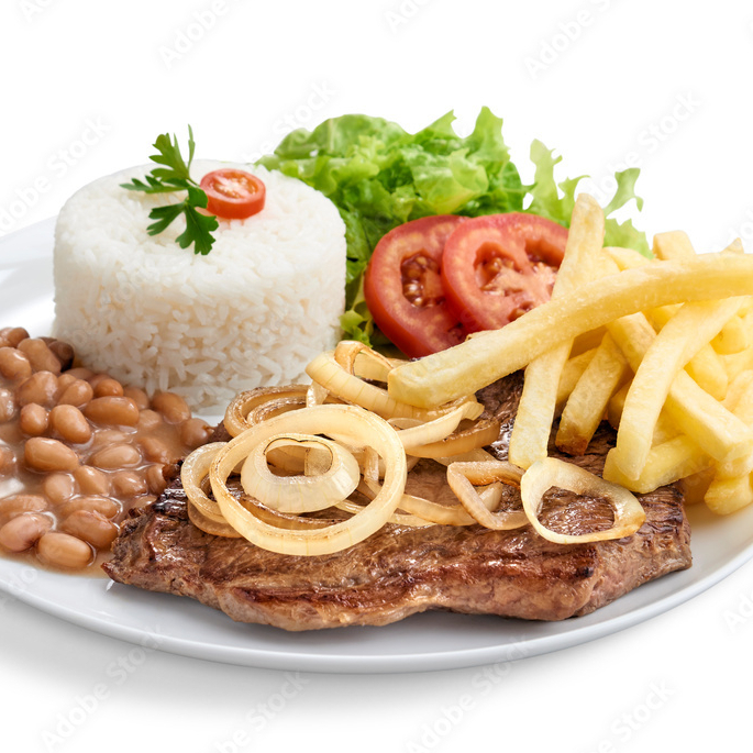 Acompanha: Arroz, feijão, batata frita e salada de tomate com alface. Serve bem 1 pessoa.
