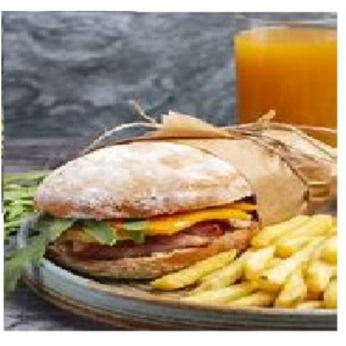 Ovo frito, peito de peru, bacon frito, maionese, tomate, alface e molho de erva. +batata fritas +suco (laranja e maracujá)