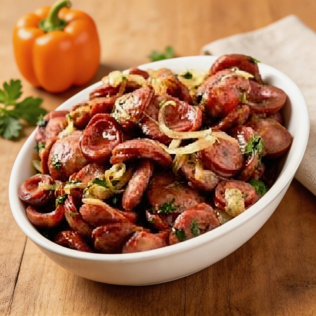 Porção de Calabresa acebolada + porção de pães + vinagrete da casa.