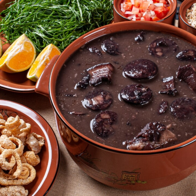 Feijoada com pertences, Arroz, Couve, Farofa, Torresmo, Banana e Bisteca