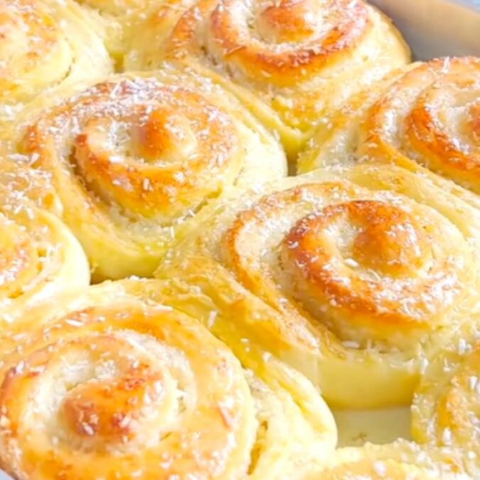 Pâo de coco com massa doce e assada com coco e cerecela com doce de leite
