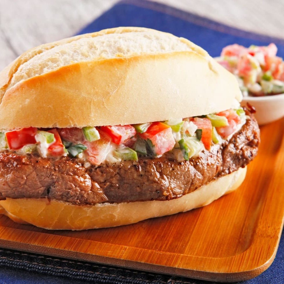 - pão de hambúrguer - hambúrguer sabor picanha 80g - queijo prato - alface e tomate - maionese
