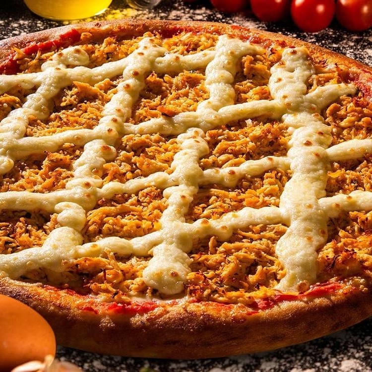- Molho de tomate - frango desfiado - Catupiry - azeitona - orégano