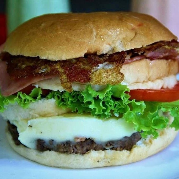 - pão de hambúrguer - hambúrguer sabor picanha 80g - queijo prato - presunto - ovo - bacon - alface e tomate