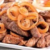 Marmita de Filé Mignon, acompanhado de arroz branco, batatas fritas e salada de alface.