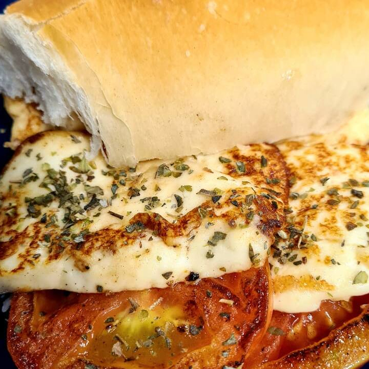 Pão francês, queijo branco, tomate e orégano. Feito na Chapa.